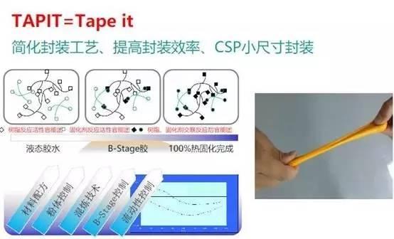 谭晓华还表示,该封装的原理就是因为B-Stage胶可以无限拉长,到了60度的时候开始有流动性,因此这项封装工艺就是利用了它在60-80°左右恢复流动性以及提升黏性的时候,完成对倒装芯片的封装。