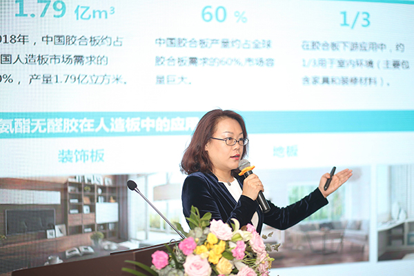 6月4日,亨斯迈公司聚氨酯事业部复合木制品总经理刘雪红在聚氨酯 “无醛添加”胶合板连续压机自动线方案发布会上提出当前中国人造板材中胶合板的生产难题,并发布中国首条聚氨酯 “无醛添加”胶合板连续压机自动线方案。