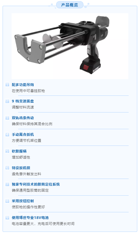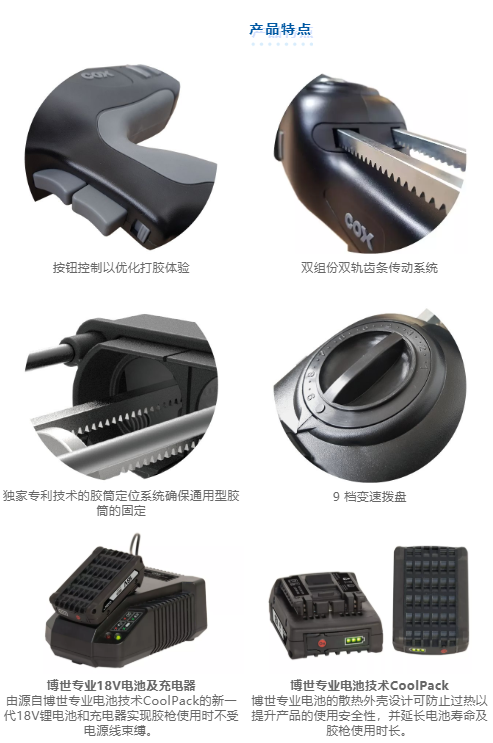 苏尔寿本次推出的新品ElectraFlow™ Dual Ultra 600 1:1,是一款全新的适用于粘合剂和密封剂的胶枪,由博世专业18V锂电池提供强大的电力支持。这款600mL胶筒型的COX™ ElectraFlow™ Dual Ultra双组份无绳胶枪对使用大容量的密封剂或双组份环氧产品的用户是非常理想的选择。由于电池技术的提升,此次选用的博世电池使用寿命更长,且与相应电压范围的工具和充电器兼容,便利性也大大提升。