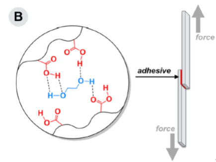 普渡大学的海洋生物胶粘剂科学家Jonathan J. Wilker团队以贻贝为师给出了一个方案,利用氢键等非共价弱键实现界面粘接的延展性。在含有氢键的的粘接层中,氢键受力断裂,耗散了应力从而减少了粘接面脆性断裂的概率(图2)。