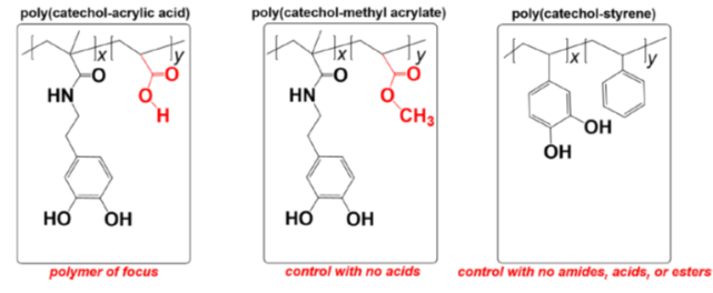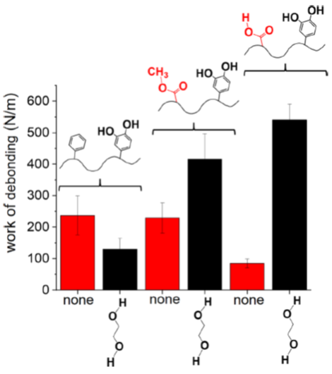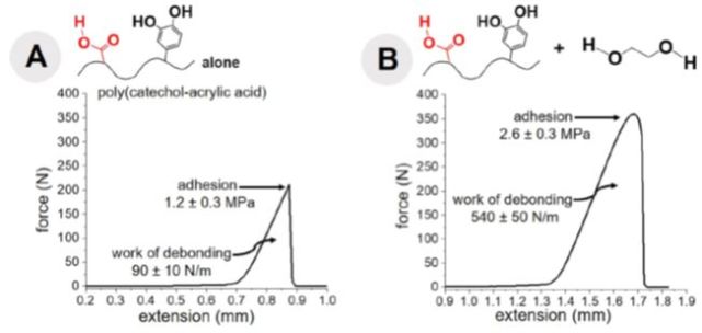 该团队合成了仿贻贝高分子儿茶酚-丙烯酸类共聚物及可控制氢键密度的高分子(图3),经粘接强度测试发现,氢键密度高的仿生高分子具有高的粘接强度和脱粘功,加入乙二醇后,强度和脱粘功显著增加。结果定量的证实,儿茶酚-丙烯酸类共聚物/乙二醇体系的脱粘功从纯儿茶酚-丙烯酸类共聚物的90N/m显著增加到540N/m,也远高于对照高分子(儿茶酚-丙烯酸酯类共聚物)/乙二醇体系的400N/m(图4.1和2)。