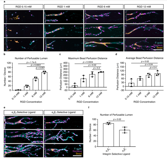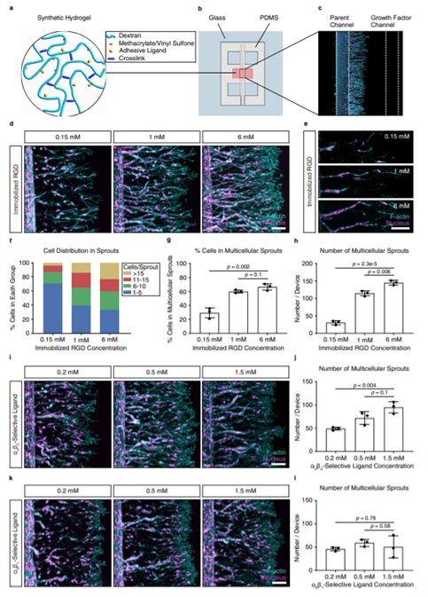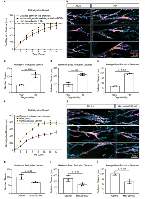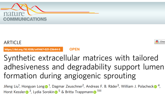 团队表明,只有在对水凝胶粘附性和降解性进行微调以支持内皮细胞的初始集体入侵,同时允许基质重塑以允许管腔打开时,才会形成长的可灌注管。这些研究提供了对细胞-基质相互作用如何调节血管生成的更好理解,因此,构成了需要血管化的组织工程材料优化设计标准的重要一步。相关论文以题为Synthetic extracellular matrices with tailored adhesiveness and degradability support lumen formation during angiogenic sprouting(具有定制粘附性和可降解的合成细胞外基质在血管生成过程中支持管腔形成)发表在《NatureCommunications》上。