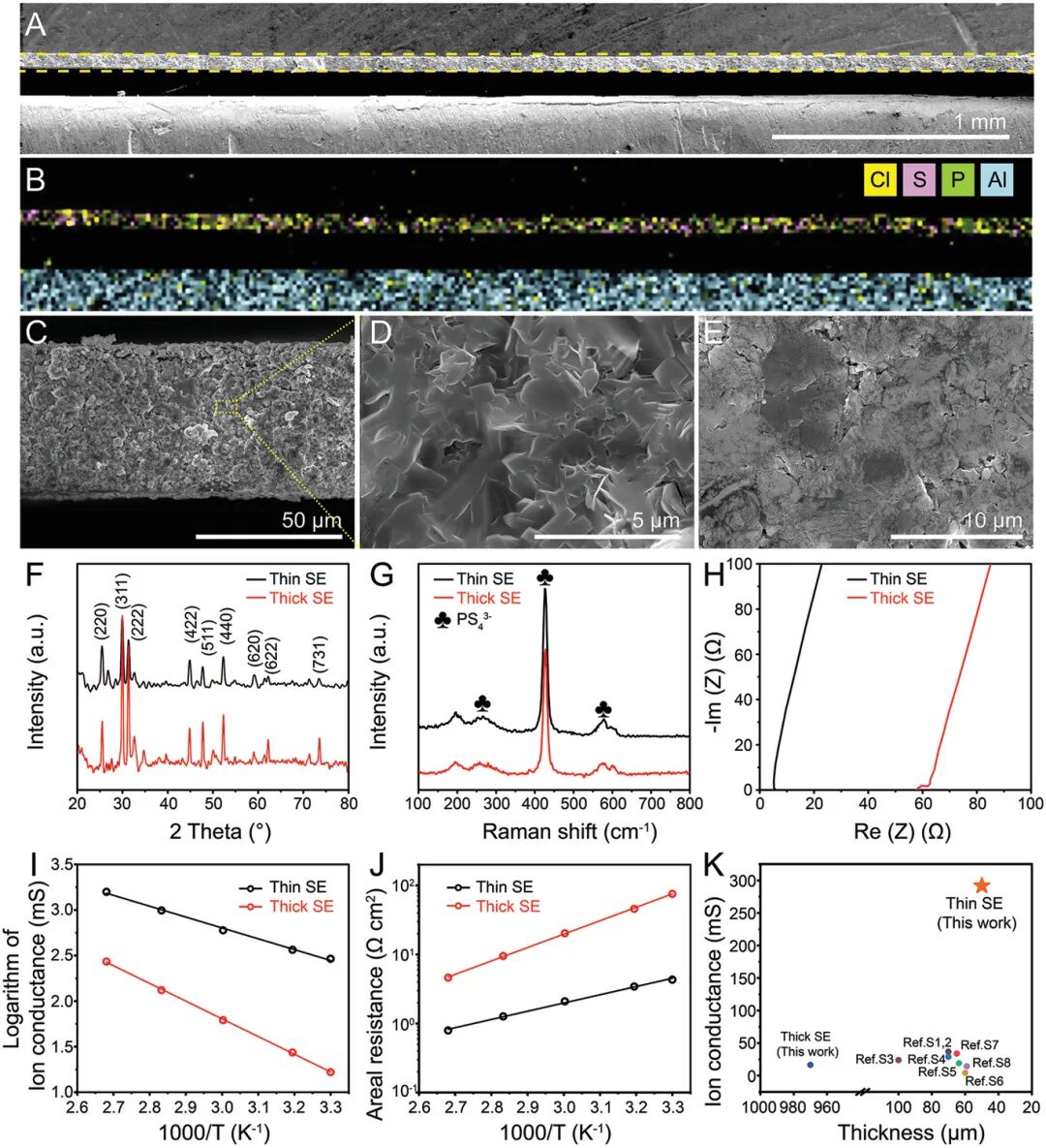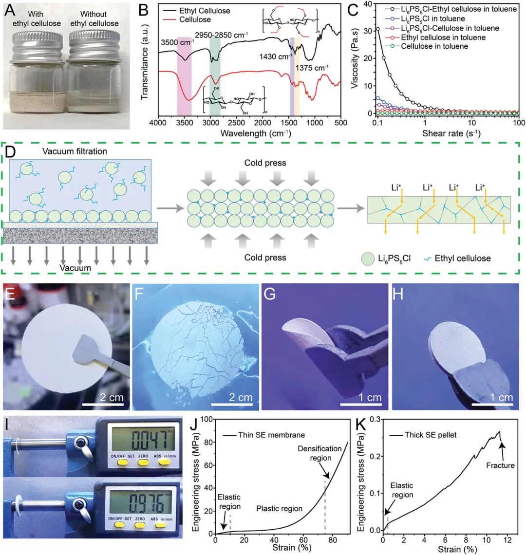 当在甲苯中分散时,Li6PS5Cl-乙基纤维素的分散体显示出比单一组分更高的粘度,表明Li6PS5Cl和乙基纤维素之间存在良好的结合。乙基纤维素的表面带有来自剩余羟基的负电荷,同时,Li6PS5Cl中的磷和锂离子作为电子受体与乙基纤维素相互作用并产生键合。这种键合有助于Li6PS5Cl在甲苯中的稳定分散,但强度不足以导致Li6PS5C降解。此外,这种强结合作用使得SE膜在过滤后能够从滤纸上剥离。因此,SE薄膜中的离子传导路径可以保持连续而不被阻塞。因此,薄SE膜同时实现了较高的离子电导率和相当大的机械强度。