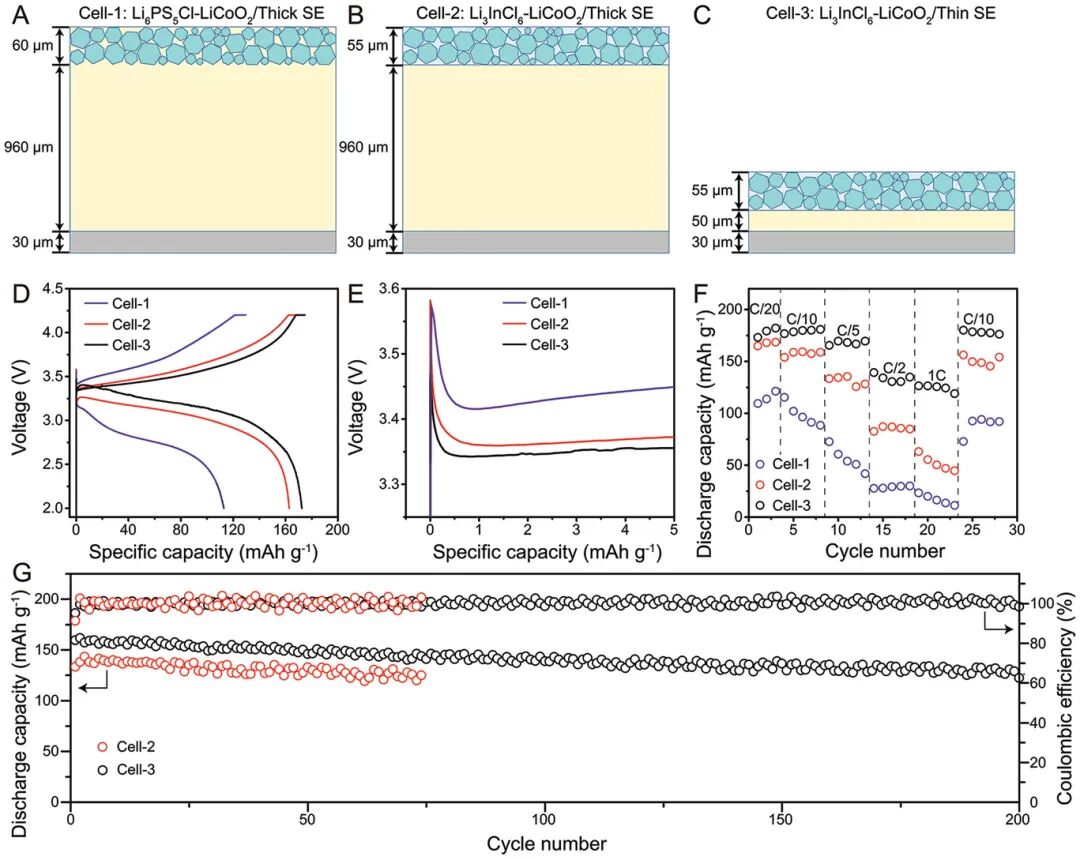 进一步评估了在正极层中用卤化物代替硫化物和降低ASLBs中SE层厚度的影响。令人印象深刻的是,cell-3(使用薄SE和LiCoO2–Li3InCl6正极)的最高放电容量为172 mAh g-1,初始库仑效率为98.3%,远优于cell-2(使用厚SE和 LiCoO2–Li3InCl6正极)和cell-1(使用厚SE和LiCoO2–Li6PS5Cl)。同样cell-3显示出优异的倍率性能,电池在C/20、C/10、C/5、C/2和1 C下分别表现出178、179、165、134和124 mAh g-1(平均)的倍率容量。显著提高的倍率性能归因于减薄SE层引起的内阻降低(或离子电导增强)。此外,cell-3在C /5倍率下循环200次后容量保持率为82%。采用这种SE薄膜的ASLB基于正极和SE层提供了325 Wh kg-1和861 Wh L-1的出色能量密度,以及175 Wh kg-1 和670 Wh L-1的电池级能量密度。