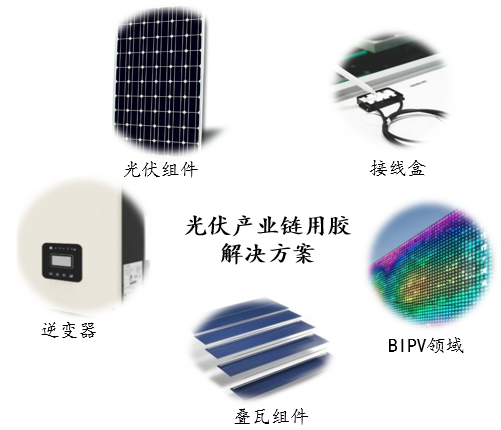 在光伏行业领域,杭州之江提供多种多样式的胶黏剂产品,如用于光伏组件边框密封的JS-606/JS-606CHUN、用于光伏组件接线盒灌封的JS-1184/JS-1184HTPV、用于逆变器灌封的JS-1184加成型、用于叠瓦组件导电粘接的ZJ-PVEP01/ZJ-PVSI01、用于光电建筑结构粘接的JS-8000PV/JS-6000PV、用于光电建筑耐候性密封的JS-2000PV等。