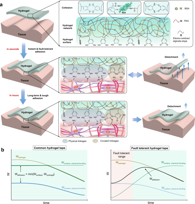 粘合剂水凝胶带由牛血清白蛋白(BSA)、电氧化海藻酸多巴和聚丙烯酸(PAA)制成。在n -羟基丁二酰亚胺(NHS)和1-(3-二甲胺丙基)-3-乙基羧二酰亚胺盐酸盐(EDC)存在下,BSA表面的氨基与海藻酸盐和/或PAA的羧基共价交联。聚合物的缠结以及多巴、胺和羧基之间的氢键提供了物理交联。此外,PAA可以吸收地表水,促进与多巴形成瞬时的、动态的强界面键。