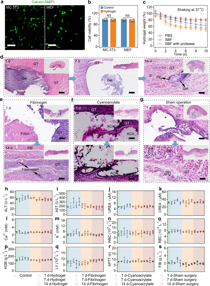 在体外生物相容性测试中,水凝胶带上几乎没有观察到死亡细胞,细胞活力为>95%。此外,电氧化水凝胶具有蛋白酶依赖性的降解性。在加入胶原酶后,水凝胶胶带在10天内迅速减轻了40%的重量,这可能主要是由于BSA的酶解导致水凝胶网络的分解。