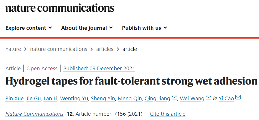 因此,南京大学曹毅教授、王炜教授团队和南京大学医学院蒋青团队合作,开发了一种新的电氧化方法,可将多巴可控地氧化为多巴醌,用于构建水凝胶胶带,该胶带兼具即时、强大的粘附。并且该胶带可以重新定位多次,而不会显示出明显的粘结强度下降。,当形成共价粘附之后,粘合强度可以达到~1268 J m−2。此外,作者证明了水凝胶胶带的生物相容性、可降解性且适合各种生物医学应用。相关工作以“Hydrogel tapes for fault-tolerant strong wet adhesion”发表在《Nature Communications》。