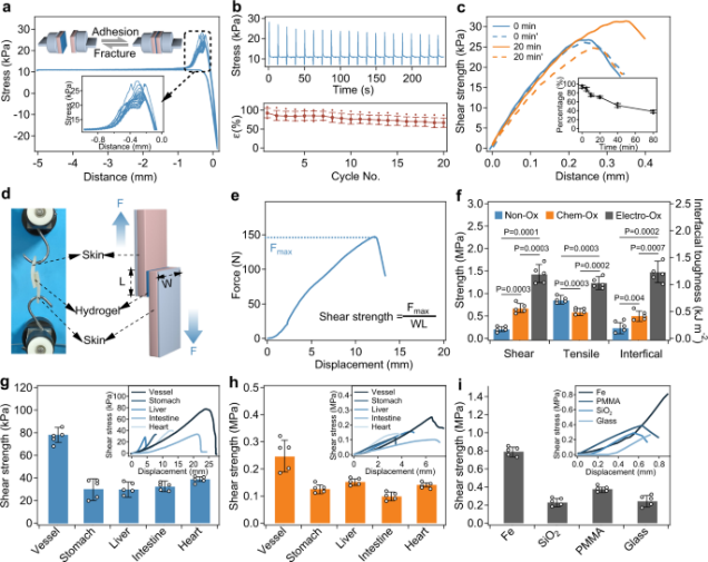 随后,在不同的时间尺度下评估了电氧化水凝胶胶带的粘接性能。结果证实了电氧化水凝胶带具有很强的瞬时粘结强度,并且可拆卸和重复使用。它的高剪切强度、抗拉强度和界面韧性使它能够在湿猪皮样品之间建立牢固的粘附。这主要归因于水凝胶具有较强的粘接力和黏聚力以及其独特的交联机制和网状结构;纳米BSA可以防止裂纹扩展,进一步提高抗拉强度;丰富的多巴醌和胺/硫醇共价键的形成确保了长期强的表面键合;强大的表面粘结和水凝胶基体的强度,确保水凝胶胶带的整体剪切和拉伸强度。重要的是,通过在界面上加入二硫苏糖醇溶液,可以使粘在有机组织上的电氧化水凝胶带脱离,很容易地去除粘在损伤组织上的电氧化水凝胶胶带。