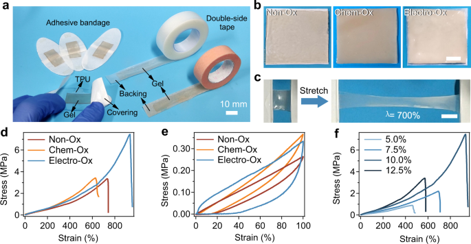 此外,电氧化方法可以选择性和可控地将多巴氧化为多巴醌,而不产生其他副产物。水凝胶表面的多巴醌可以与组织表面的氨基形成共价键,建立长期强粘附。水凝胶内的多巴醌可与未氧化的多巴形成氢键,与BSA表面的氨基形成共价键,进一步强化水凝胶网络。多巴醌和在组织表面的胺或硫醇的缓慢反应,使水凝胶磁带可以提供长期附着力和可逆脱离的时间窗口,因此制成了兼具物理和化学键合的水凝胶带。