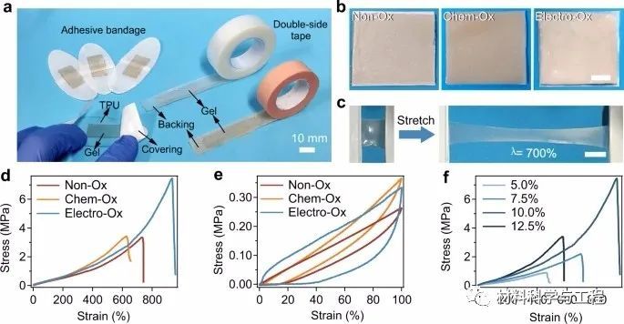 图2 海藻酸多巴电氧化水凝胶带的力学性能。