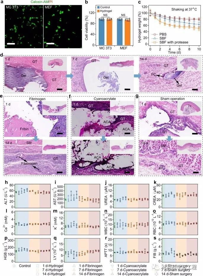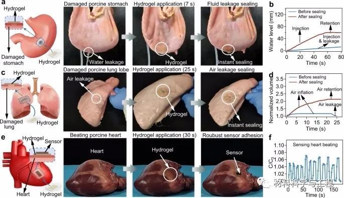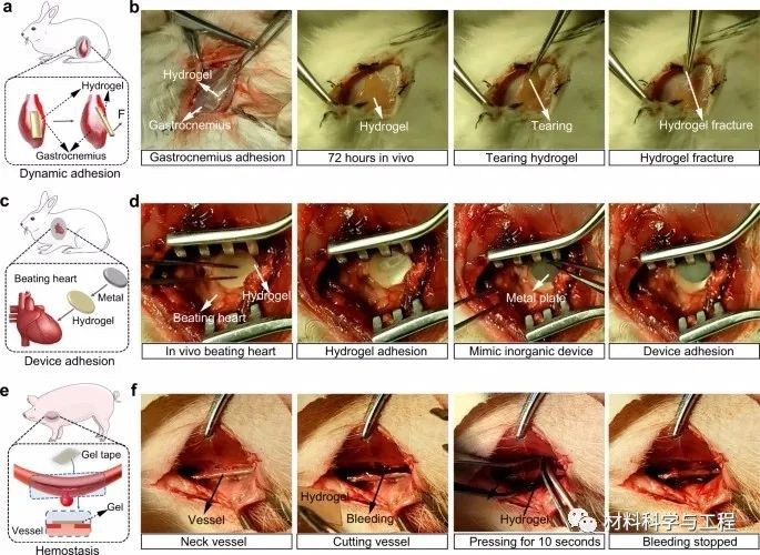 研究者进一步证明了水凝胶胶带作为可穿戴和植入设备的组织密封剂和粘合剂的成功应用,甚至在动态和出血的组织表面。水凝胶带具有生物相容性、可降解性,适用于各种生物医学应用。快速、强湿粘接与容错实用外科手术相结合的演示,可能会启发下一代水凝胶胶带的设计,使其能够在具有挑战性的手术条件下发挥作用。(文:水生)