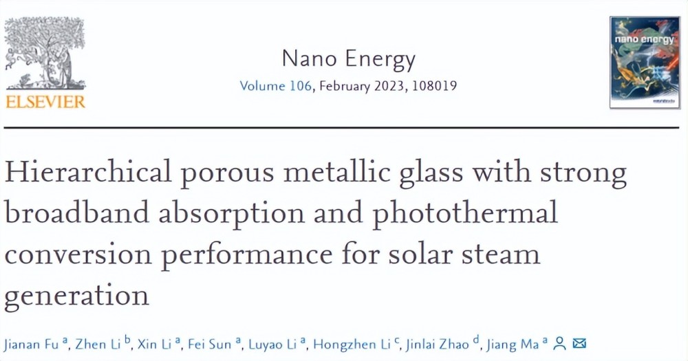 近日,相关论文以《用于太阳能蒸汽产生的具有强宽带吸收和光热转换性能的多级多孔金属玻璃》(Hierarchical porous metallic glass with strong broadband absorption and photothermal conversion performance for solar steam generation)为题发在 Nano Energy(IF 19.07)上,且被选为同期的背封面文章,傅佳男是第一作者,马将担任通讯作者。