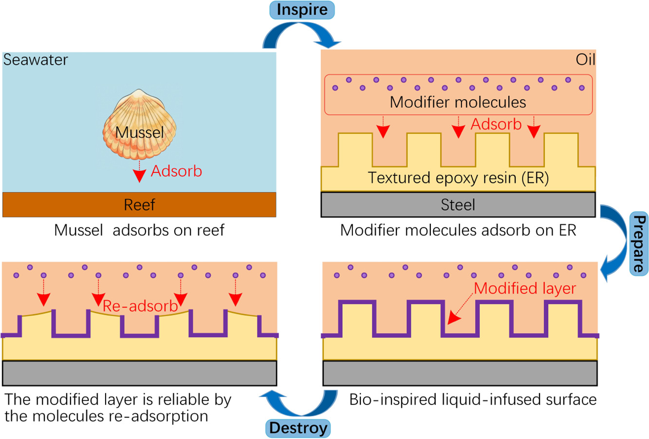在自然界中,已经观察到某些动物的自发吸附行为,这些行为被认为是提高改性层可靠性的潜在灵感来源。以一些海洋无脊椎动物(如贻贝、藤壶等)为例,它们会自发吸附在海水中的附着基质(如礁石、船舶等)表面。在这种情况下,即使这些无脊椎动物被人工去除,新的无脊椎动物也会在相对较短的时间内重新吸附到附着基底上。因此,换言之,附着基板的表面几乎总是被吸附剂覆盖。受此启发,如果用于构建改性层的分子能够以自由状态存在(类似于贻贝),并且能够自发吸附到纹理基底上,那么对于 LIS 来说将是有利的。其原因是,在这个新颖的想法中,如果已经吸附在基材上的分子被损坏,游离分子将重新吸附在受损区域,从而实现持久的改性层。