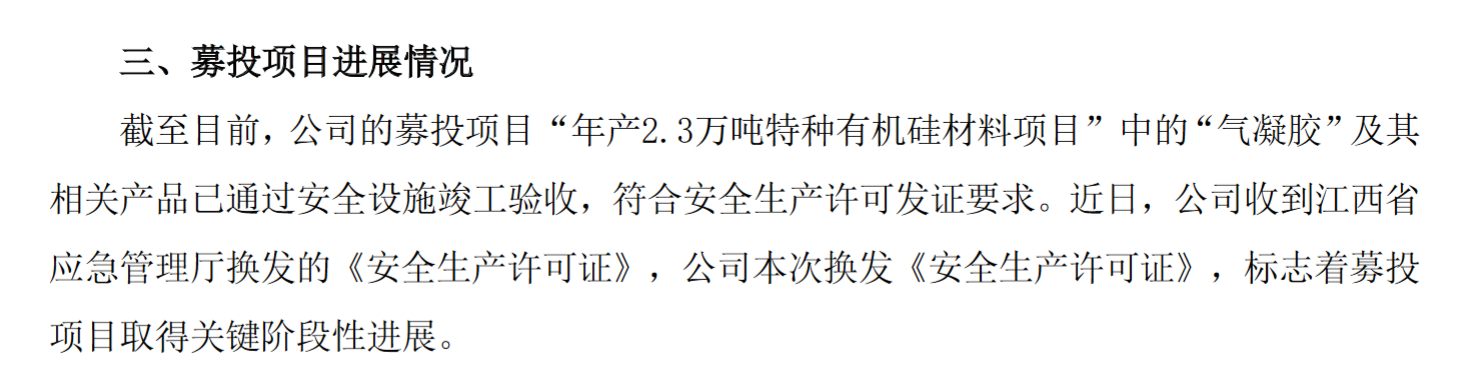 目前已有江苏丹阳、江西九江湖口生产基地,并正在推进安徽铜陵和宁夏中卫基地的建设。晨光新材在江西和安徽同时布局了功能性硅烷和气凝胶,而宁夏则以气凝胶和三氯氢硅项目为主。其中包括13亿元投资安徽铜陵年产30万吨功能性硅烷(气凝胶2.5万立方)气凝胶新材料项目;20亿元投资宁夏中卫年产30万吨硅基及气凝胶新材料项目;30亿投资江西湖口年产5万吨硅基气凝胶、6万吨功能硅烷和3万吨特种功能硅基新材料项目; 江西湖口高新技术产业园项目(投资12.4亿元,年产21万吨硅基新材料及0.5万吨钴基,包括5万吨/年气凝胶);以及上述江西九江年产2.3万吨特种有机硅材料项目。