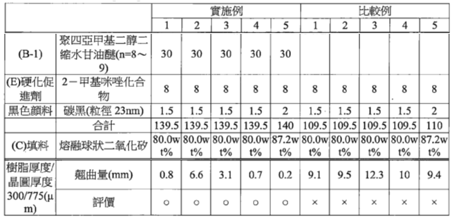 由上表可见,比较例1-5基本都有明显的翘曲情况发生,LMC封装完后,翘曲程度基本都>9mm;而实施例1-5,最糟糕翘曲程度为6.6mm,最佳配方的翘曲度则只有0.2mm,很好地证明了该技术可以有效抵抗晶圆封装时的翘曲。