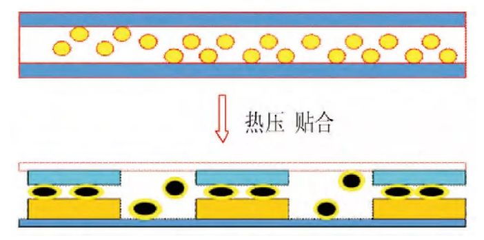图为包含固化剂、需要低温保存、预涂在离型基材上的带状ACF,使用时去除上下离型层、贴合、热压固化;压合后多余的导电微球被挤到空隙处,留在上下微电极间的微球导通电路,与左右的微球不接触,导电性被限制在上下方向。