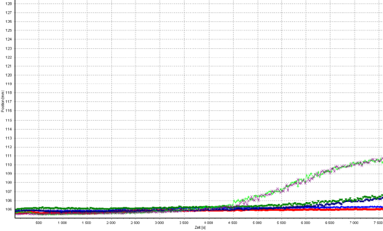以PU3样品为例,红色是初始谱线,绿色是2h测试结束后的谱线。该样品初始透光率较高,实验过程中d顶部透光率逐渐升高,出现了沉降现象;且底部透光率也出现了升高,即同时有上浮现象的出现。