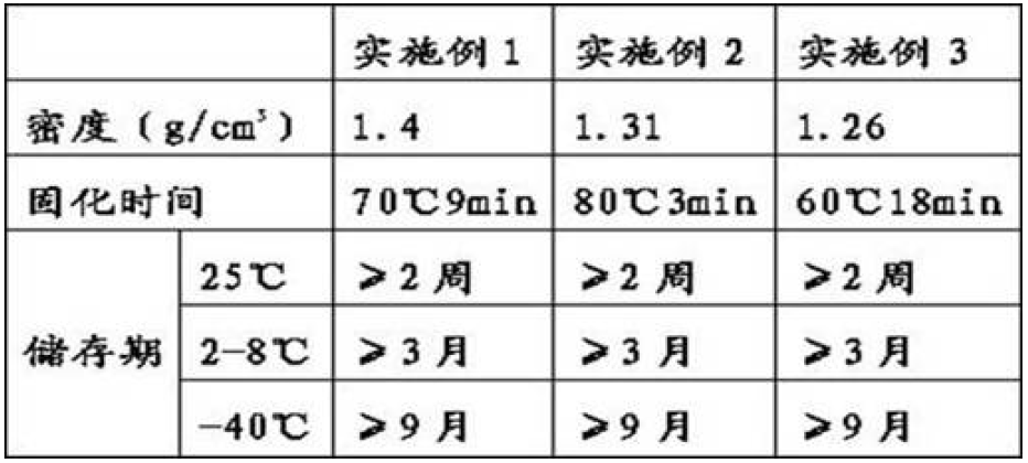 可见,最佳的实施例3只需在60℃下加热18℃就能完全固化,-40℃下储存期长达9个月。