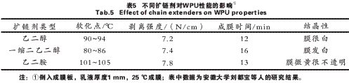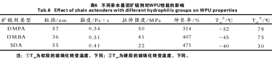 D.J.Hourston等人研究了二羟甲基丙酸(DMPA)、二羟甲基丁酸(DMBA)和含磺酸基的二醇(SDA)扩链的WPU乳夜的性能和胶膜的力学性能,见表6。