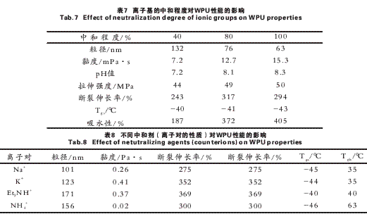 离子基的中和程度主要影响分散液的性质和贮存稳定性。对于阴离子型水性聚氨酯,其pH值一般控制在8~9乳液比较稳定。对于阳离子型水性聚氨酯,则pH值一般控制在5~6乳液比较稳定。在离子基含量适当的情况下,一般均采用100%中和。表7为离子基的中和程度对WPU性能的影响(中和剂为NaOH)。
