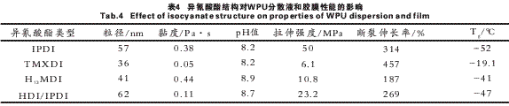 Kobylanska等人研究了不同结构的异氰酸酯如异佛尔酮二异氰酸酯(IPDI)、4,4’-二环己基甲烷二异氰酸酯(H MDI)、六亚甲基二异氰酸酯(HDI)和四甲基苯12二亚甲基二异氰酸酯(TMXDI)对WPU分散液和胶膜性能的影响,见表4。