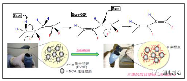 2)化学凝胶:在制备高镍或高碱性活性材料的过程或静止过程中,容易产生化学凝胶现象。这是因为 PVDF 在碱基的高 pH 环境(如下图所示),高分子主链容易脱 HF 生成双键,同时浆料中存在的水分或者溶剂中的胺进攻双键,形成交联,从而严重影响降低了生产能力,恶化电池性能。一般随着活性材料碱性的增大,浆料凝胶现象越严重。