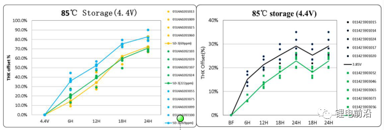 实例:SD-3 在 85℃存储时电芯容易产气,导致电池膨胀较大。通过将电芯水分控制在100ppm 以下,和高 SOC 化成,高温存储问题得到了明显的改善。
