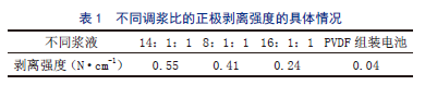 不同调浆比的正极剥离强度的具体情况如表1所示。