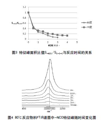 图3 是70℃与80℃不同时间反应物料红外谱图中特征峰面积比值S-NCO/SC-O-C 与反应时间的关系。图4 为80℃反应物料FTIR 谱图中-NCO 特征峰随时间变化图。