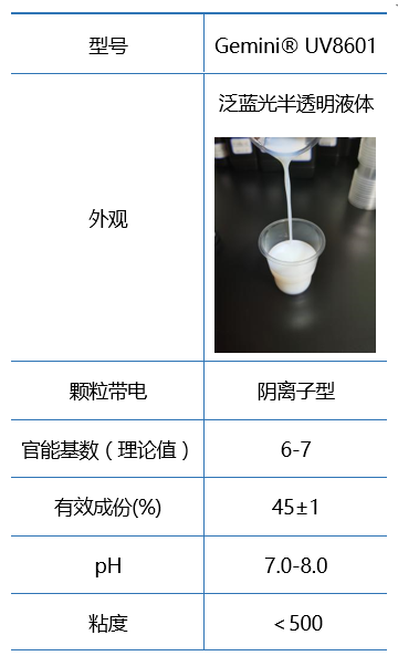 Gemini® UV8601是一款脂肪族聚氨酯丙烯酸酯UV水分散体,突出的耐磨性,具有高硬度、高耐磨特点,PC基材耐100℃水煮,推荐用于对耐磨有要求的银粉漆及罩光面漆。产品规格如下所示: