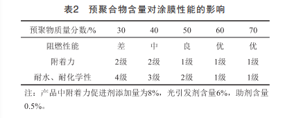 (2)当预聚物含量60%,附着力促进剂含量为8%,光引发剂含量为6%时,该紫外光固化涂膜的附着力为1级、硬度为3H,耐湿热性和阻燃性能良好。