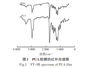 纯水性聚氨酯以及PETA改性PUA胶膜的红外光谱图,如图1所示。