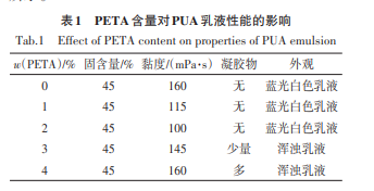 PETA含量对 PUA 乳液性能的影响 ,如表 1 所示。