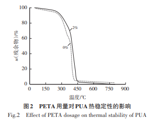 PETA 含量为 0 和 2% 的两个热重曲线,如图 2 所示。失重曲线大致可分为两段,第一段为 0~ 375 ℃,为聚氨酯软段的失重;第二段为375~525 ℃, 为聚氨酯中硬段的失重。