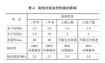 由表 4 可知,与使用二甲苯或三甲苯作溶剂相比,使用乙酸乙酯或乙酸丁酯作溶剂制得的底涂剂表干时间和实干时间较短。但是,使用乙酸乙酯或乙酸丁酯溶剂制得的底涂剂没能完全渗透,耐水性较差。综上,溶剂使用二甲苯或三甲苯,制得的底涂剂综合性能较佳。