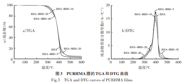 通过TGA测试表征MBD树脂对于PURHMA热稳定性的影响。PURHMA膜在氮气氛围下的TGA和DTG曲线如图3所示,具体结果如表4所示。