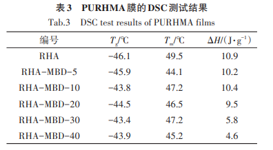 采用DSC对PURHMA膜的热性能进行了研究。PURHMA膜的DSC曲线如图1所示,相关结果如表3所示。
