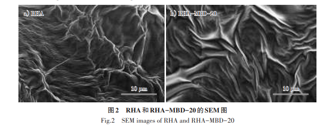 由图2a)可知:RHA样品表面存在较多分散均匀的直径约为0.1mm的纤维状条纹,这些纤维状条纹由THF刻蚀后留下的结晶性较好的PHA-3500链段组成。由图2b)可知:RHA-MBD-20样品表面也存在大量均匀的纤维状条纹,并且其直径相对于RHA样品更大,约为0.5mm。上述现象说明,MBD树脂与PU相容性较好,且其与PHA-3500链段聚集在一起。