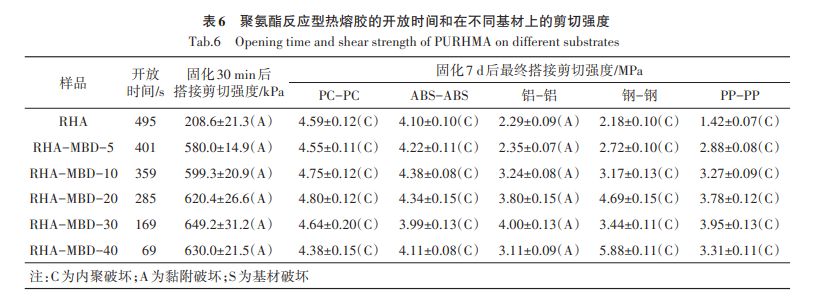 由表6可知:随着MBD树脂添加量的增加,胶的开放时间明显缩短,初粘强度显著增大。这是由于高T(g68.8℃)的MBD树脂的加入加快了胶的物理固化速度。MBD树脂的加入对PURHMA与PC和ABS基材的最终粘接强度帮助不大,但对铝、不锈钢以及等离子体处理过的PP基材的剪切强度均有大幅提升。与不含MBD树脂的RHA相比,RHA-MBD-20对铝、不锈钢以及等离子体处理的PP基材的剪切强度分别提升了66%、115%和166%。当进一步提高MBD树脂的添加量到30%时,PURHMA对不锈钢的剪切强度有所降低,但对铝和PP基材的剪切强度进一步提高。