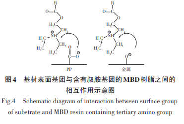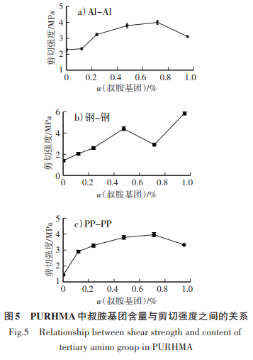以上结果表明,含有叔胺基团的MBD树脂能显著提升PURHMA对金属基材(铝与不锈钢)和PP非极性基材的粘接,这对拓展PURHMA的实际应用具有重大意义。由于MBD树脂中叔胺(—NR3)弱碱性基团能分别与铝基材表面上的Al—OH、不锈钢基材表面上的Fe—OH和等离子体处理后的PP基材表面上的—COOH等弱酸性基团形成Lewis酸碱作用,如图4所示,从而大幅提高PURHMA对这些基材的粘接强度。PURHMA在铝、不锈钢和PP基材的粘接中叔胺基团含量与剪切强度之间的关系如图5所示。