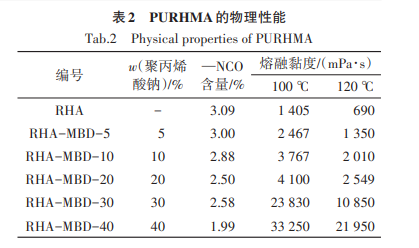 PURHMA的黏度主要受温度、分子量、分子结构和分子链之间相互作用等的影响,PURHMA的基本物理性能如表2所示。