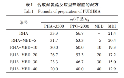 在配有热电偶、搅拌装置、真空接口的500mL四口烧瓶中,加入定量的PHA-3500、PPG-2000和MBD树脂,在110℃下真空脱水2h后,加入计量的MDI后,在氩气气氛和110~120℃下反应1h,当体系的—NCO含量与理论值接近时,出料得到PURHMA。具体合成聚氨酯反应型热熔胶的配方如表1所示。
