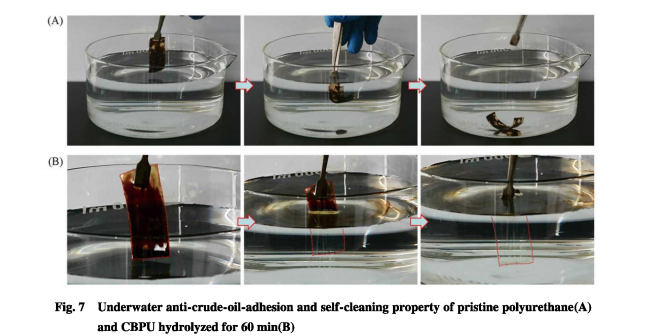以黏度较大的原油为污染物,表征了水解60min的CBPU的水下抗原油黏附性能(图7).图7(A)为未水解的聚氨酯材料在水下对原油的黏附性过程图.未水解的聚氨酯材料极易被原油紧紧黏附,水下疏油性能很差.