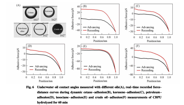 进一步测试了水解60min的CBPU对十六烷、煤油、石油醚、异辛烷和原油的水下疏油性能.由图6(A)可见,水解60min的CBPU对十六烷、煤油、石油醚、异辛烷和原油的水下油接触角分别为161,162,170,162和162'均大于160'进一步证实水解60min的CBPU是一种水下超疏油材料.由图6(B ̄F)可见,7C解60min的CBPU对十六烷、煤油、石油醚和异辛烷的水下油黏附力均为0,甚至对黏度较大的原油的水下油黏附力也为0,表明水解60min的CBPU具有超强的水下抗油黏附性能.