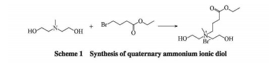 将0.10mol(11.9160g)的7V-甲基二乙醇胺和0.10mol(19.5050g)的4-溴丁酸乙酯混合,于60T温度下以60r/min速率搅拌24h后,置于密封环境中约2d,得到白色的季铵离子型二元醇固体.合成过程见Scheme1.