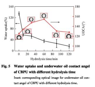 两性离子物质能够吸引水分子并结合水分子形成水合物,进而在物质表面构建出水合层.吸水率可以表征两性离子聚氨酯水凝胶的水合特性.测试了不同水解时间的CBPU的吸水率(图5).可见,未水解的聚氨酯材料的吸水率高达135.0%,C解1〇,30,60,90和120min时CBPU的吸水率则逐渐降低为58.1%,53.8%,36.2%,27.1%和17.3%.显然,随着水解时间的增加,CBPU的吸水率不断降低.可能是因为随着水解的不断进行,一C00的含量增加,不同分子链上一C00与季铵离子之间的相互吸引作用力越来越大,分子链间的空间越来越小,从而导致分子链的水合性能下降,吸水率越来越小.由不同水解时间的CBPU二氯乙烷的水下油接触角(图5)也可见,未水解的聚氨酯材料对二氯乙烷的水下油接触角(UOCA)为125.4°.随着水解的不断进行水下油接触角逐渐增加,水解10min时为134。,水解30min时为147.3,最大增加至水解60min时的154.5°,但随后逐渐降低为水解90min时的130.5°,7jC解120min时的128°.可见,7C解时间为60min时,CBPU的水下疏油接触角最大,达到了水下超疏油的水平.水下疏油接触角随水解时间的变化趋势和其吸水率的变化趋势不同,说明了水下疏油接触角和吸水率之间没有必然联系?
