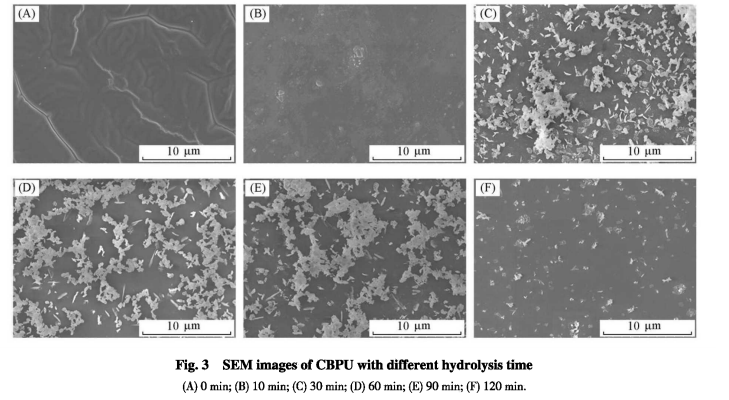 通过SEM观察了CBPU的表面形貌.图3(A ̄F)分别是未水解的聚氨酯材料和水解10,30,60,90,120min的CBPU的SEM照片.由图3(A)可见,未水解的聚氨酯材料表面存在沟壑样纹路,推测是因为未水解聚氨酯材料在冷冻干燥时产生较大的形变,从而使得表面产生开裂.由图3(B)可见,水解lOmin的CBPU表面有大小不一的颗粒状、片层状物质产生.由图3(C ̄E)可见,随着水解时间的增加,水解30,60和90min的CBPU表面产生大量团聚物,表面粗糖度相比水解lOmin的表面粗糙度明显增大.由图3(F)可见,水解120min的CBPU表面团聚物明显减少,团聚物体积也明显减小.可见,随着水解时间的增加,CBPU表面粗糖度先増大后减小.