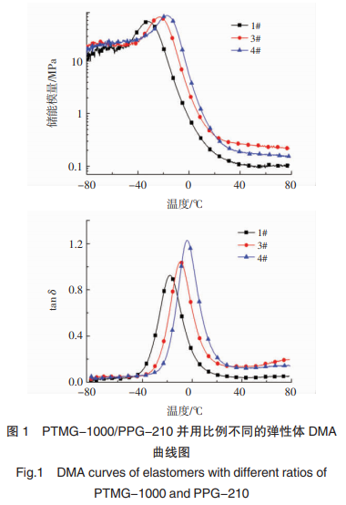 实验表明,随着PPG-210含量增加,聚氨酯弹性体的储能模量呈现增加趋势,并且曲线峰值左移,即向高温方向移动。损耗因子峰值向高温方向移动,即玻璃化转变温度逐渐升高,并且峰值增加,峰型对称(见图1)。