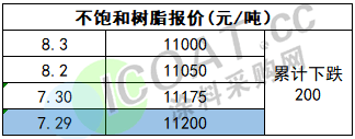 不饱和树脂报价11000元/吨,目前已实现三连跌,累计下跌200元/吨。